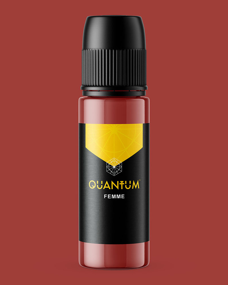 Unleash the earthy allure of Quantum EU REACH Gold Label Tattoo Inks 'Femme,' a tattoo ink color that whispers secrets of terracotta tales and muted moments in shades of red. This isn't your garden-variety red; oh no, 'Femme' is a sultry blend of deep, dark terracotta—a perfect melange of brown and burgundy that seduces the senses and teases the boundaries of the conventional.